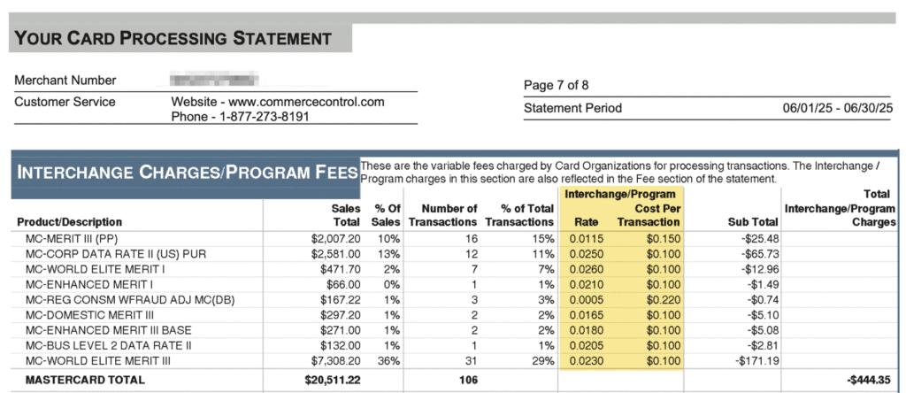 Your processor should be breaking down all of the interchange rates on your monthly processing statement. Here’s a sample from a recent statement from one of our clients, showing all of their Mastercard interchange rates from June 2025: