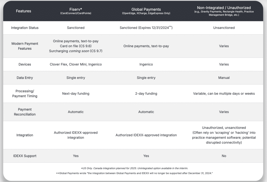 - Cornerstone/IDEXX (the software provider) needs to support a third-party payment processor and payment gateway.