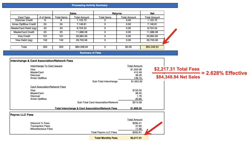 Effective Rate = (Total Merchant Fees) / (Total Net Card Sales Volume)