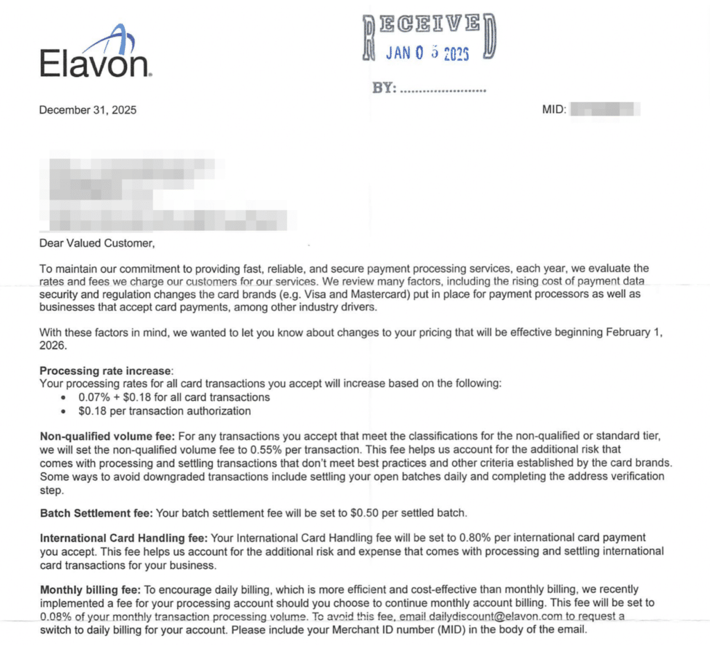 Exactly one year after their last rate increase, Elavon sent a notice to merchants about another rate hike effective 2/1/2026. Here’s what’s going up: