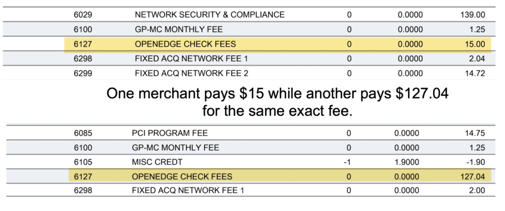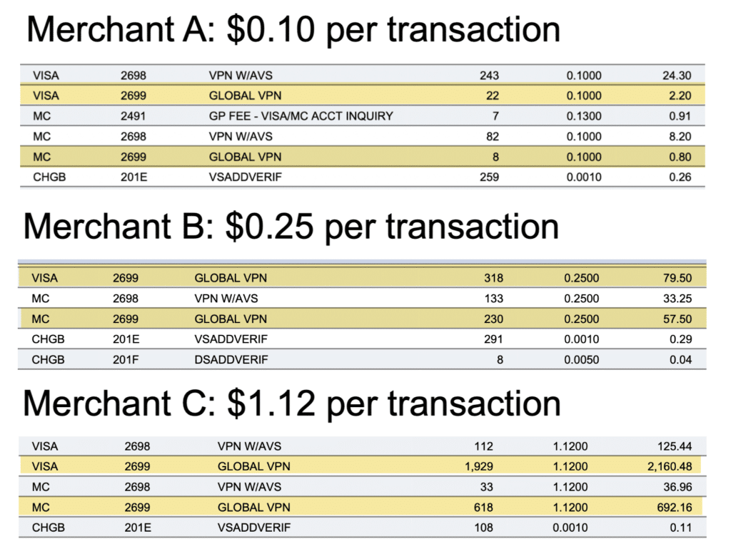 But Global Payments charges their own “Global VPN” fee as an additional markup on top of the card network fees. And similar to all the other fees we’ve covered so far, this one varies drastically depending on the merchant account we’re looking at: