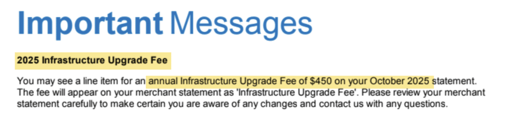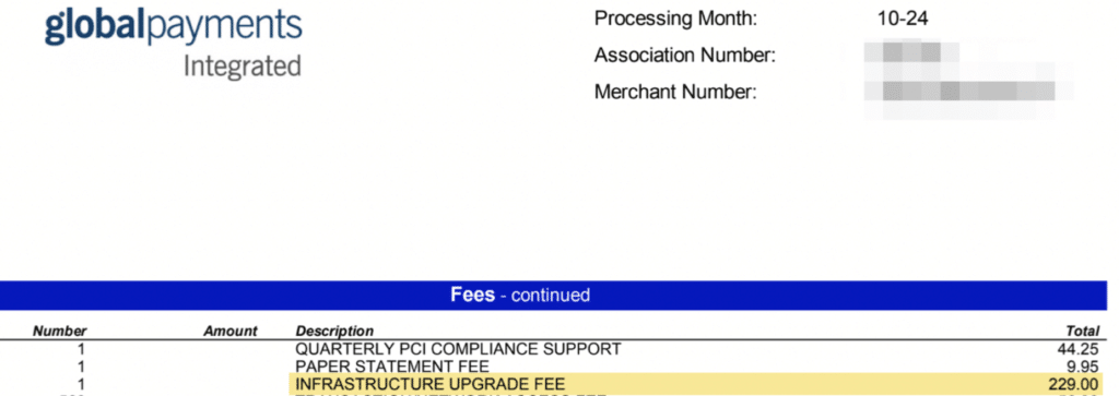 Global’s Infrastructure Upgrade Fee is just an annual fee disguised with a fancier name. This is one that’s charged across all Global subsidiaries (TSYS, Heartland, Cayan, etc.), and the amount increases every year.
