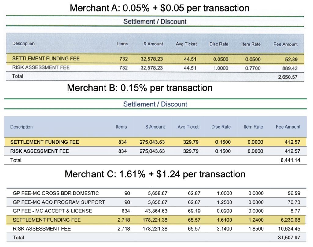Alone, this is obviously a lot. But think about how much extra you’re paying when it’s combined with those settlement funding charges. Here’s what that additional markup looks like for those three merchants: