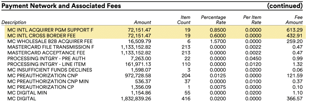 It’s also worth noting that your international transactions still count toward your total Mastercard volume, so the standard 0.14% credit assessment is applied on top. That’s 1.59% in assessment fees on these transactions before you factor in the interchange rate and processor markup.