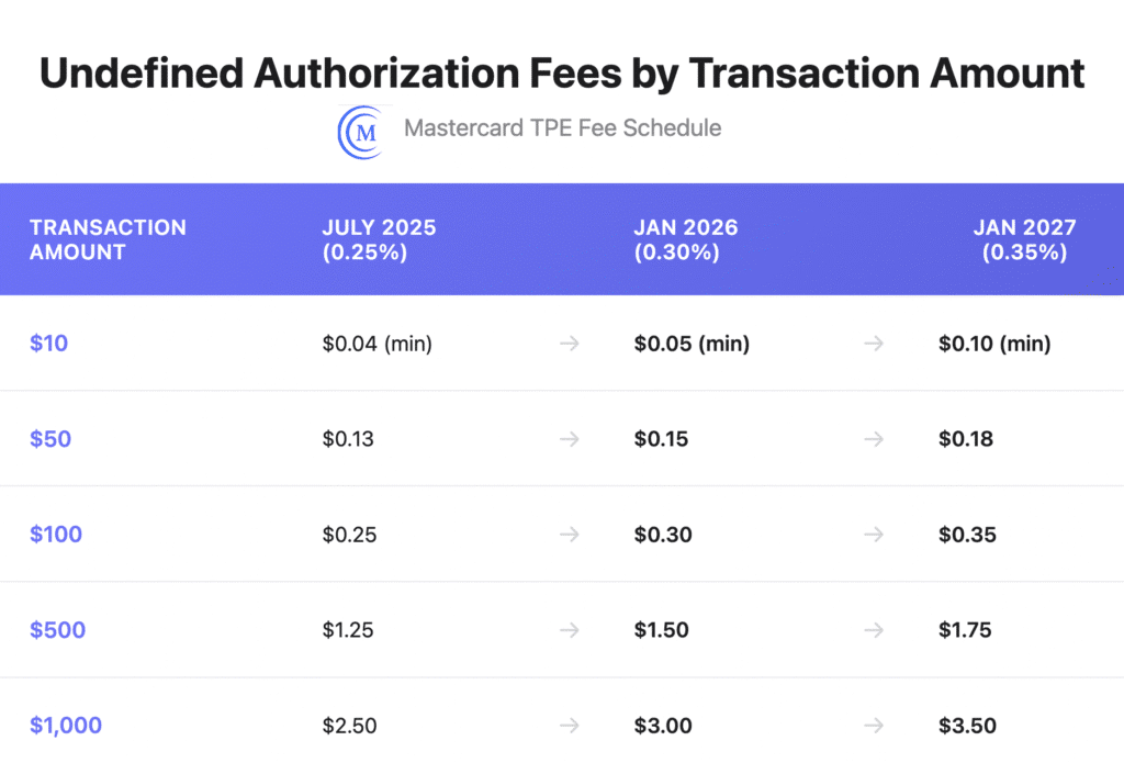 - July 2025 – TPE Fee for undefined authorizations increased to 0.25% (minimum $0.04).