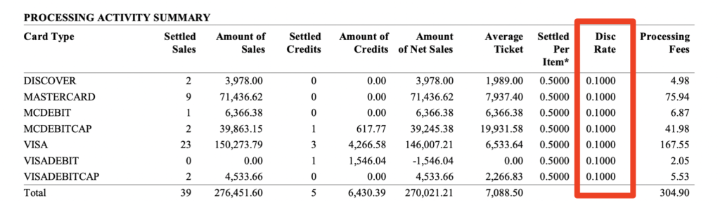 And here’s a different format from another processor that shows the discount rate alongside interchange itemizations: