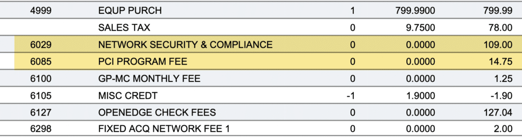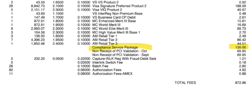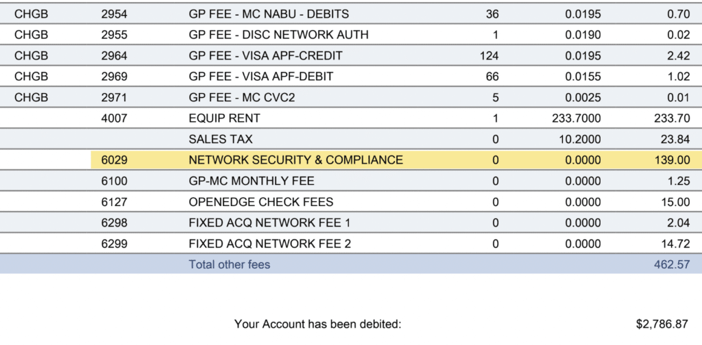 And how do I know this has nothing to do with PCI compliance? We see PCI fees charged separately on the same statements being hit with a Network Security & Compliance Fee: