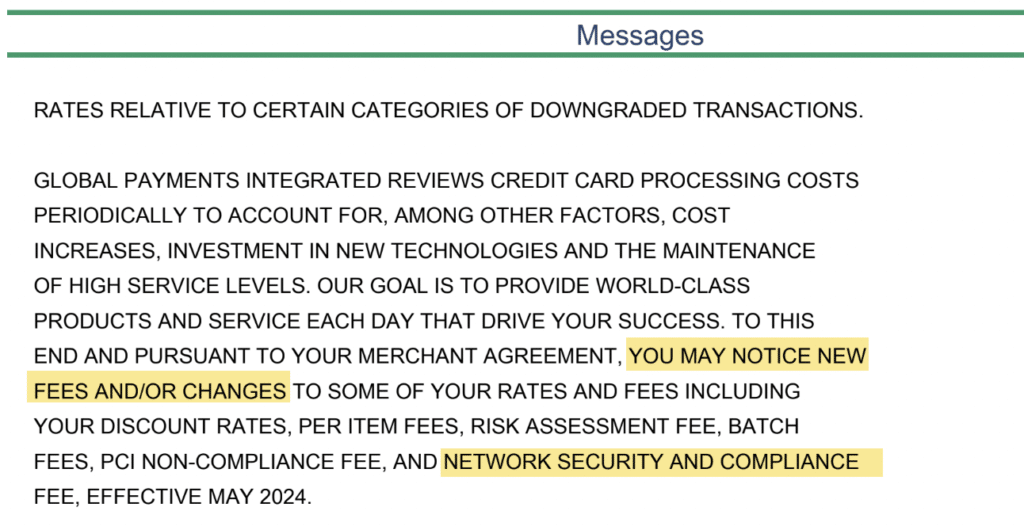 Global used to sell some merchants “Compliance Service Package” for $139 per month. But as people opted out or chose not to sign up, we noticed that Global quietly started rolling out its Network Security & Compliance Fee on statements for the exact same price. $139 per month.