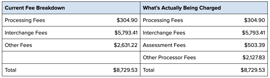 Let’s compare the difference between how this processor categorizes its fees and what would be a more accurate breakdown: