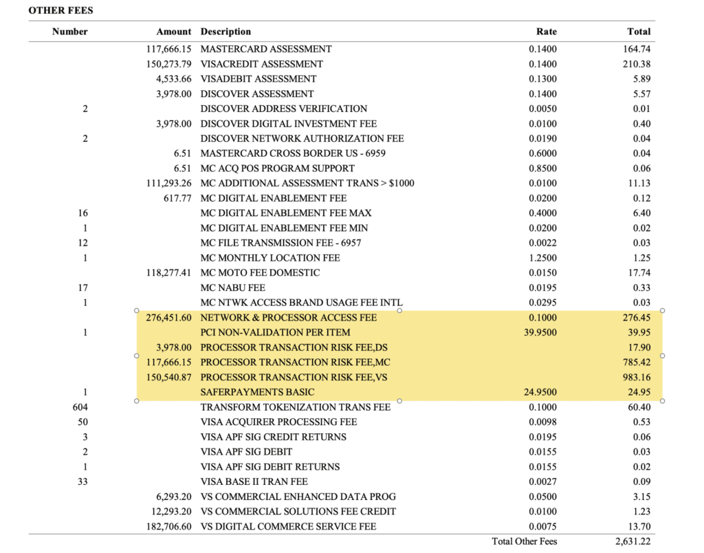 - Other Fees — If assessments aren’t in their own section, they’re typically listed here alongside miscellaneous processor markups.