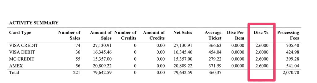 The top line is the processor’s discount rate (in this case, a 0.06% markup for Visa and Mastercard, and 0.18% markup for Amex), and the bottom line is the interchange rate that’s been passed-through the processor to the merchant.