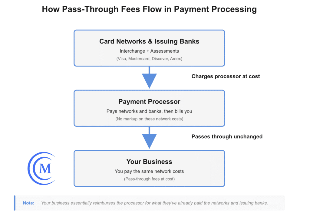 Pass through fees are payment processing costs charged by the card networks and issuing banks that payment processors pass along to merchants at cost. They consist of two main categories: