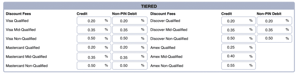 Tiered pricing gets a bit more complicated because it can be structured in different ways. But typically, the processor gives you three different rates that your transactions can fall into: