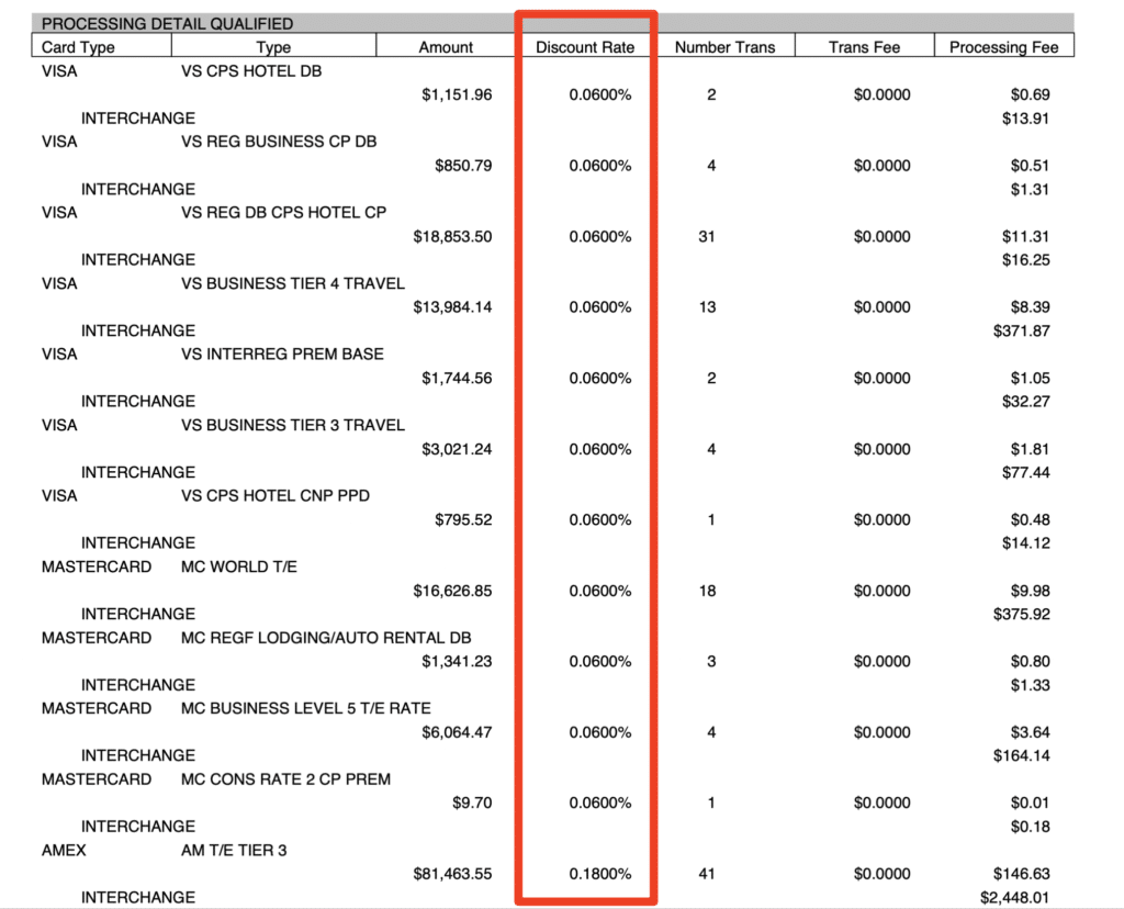 Here we can see this merchant is paying a 0.06% discount rate for Visa, Mastercard, and Discover. And 0.18% for American Express: