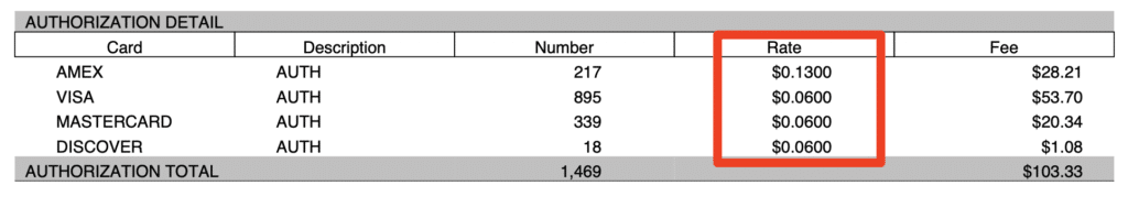 But if we look a bit closer on another page of the statement, we can see that Shift4 is charging them $0.06 per authorization for VS, MC, DS, and $0.13 per auth on Amex.