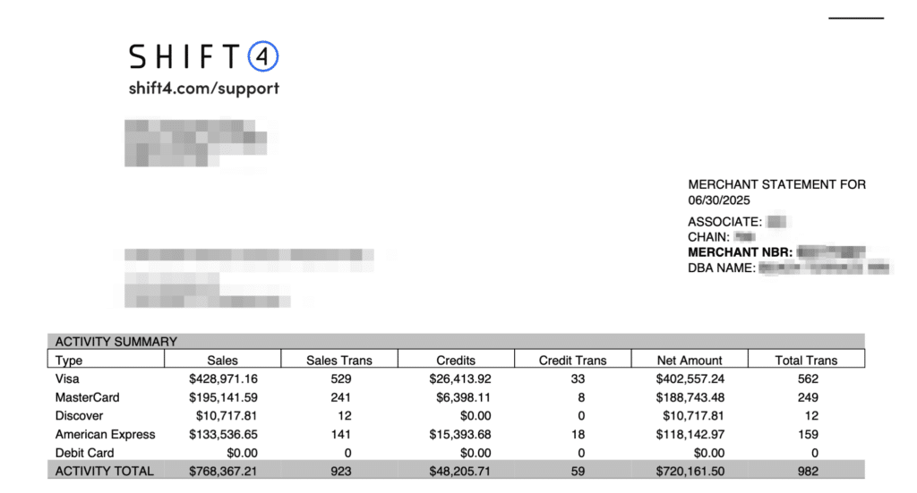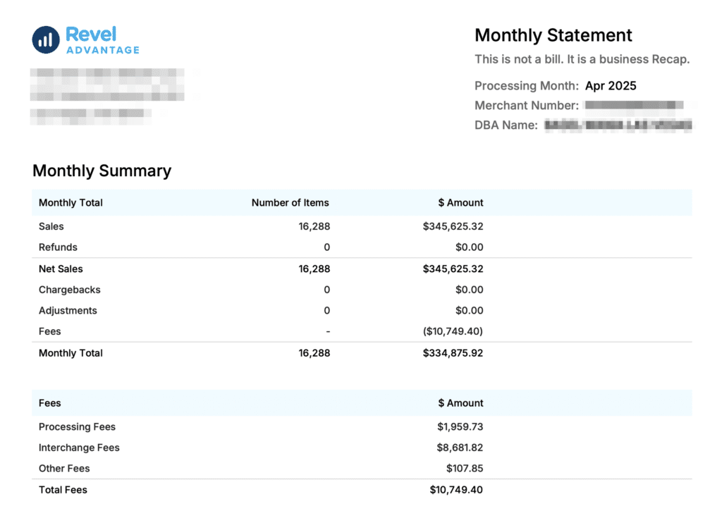Let me show you a monthly statement summary from a local deli. They’re using Revel Advantage from Revel POS (which is owned by Shift4).