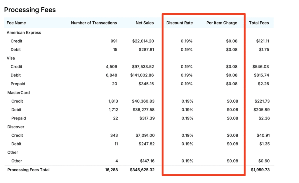 When we look at the processing fees by card type, we can see that this merchant is paying 0.19% + $0.08 per transaction for all cards.