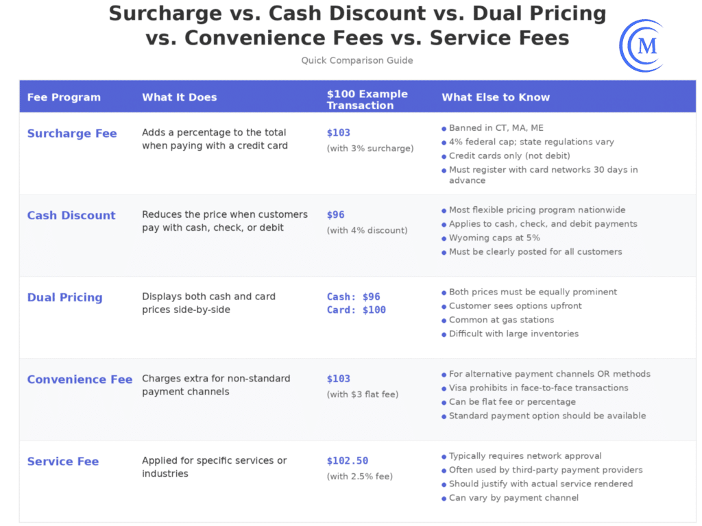 Side-by-Side Comparison of Surcharge Fees, Cash Discounts, Dual Pricing, Service and Convenience Fees