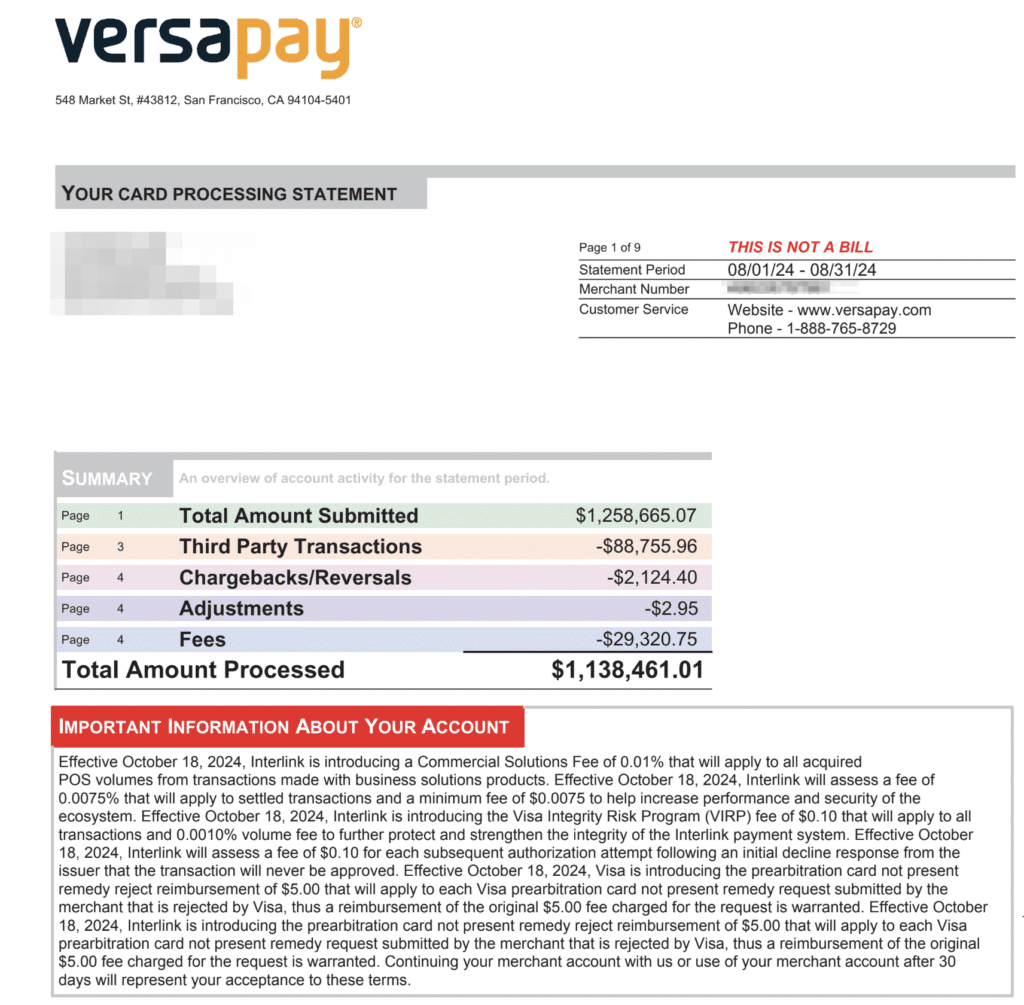 Read on to learn more about Versapay, including fees and real examples of statements—plus tons of added tips based on our experience working with Versapay on behalf of our clients.